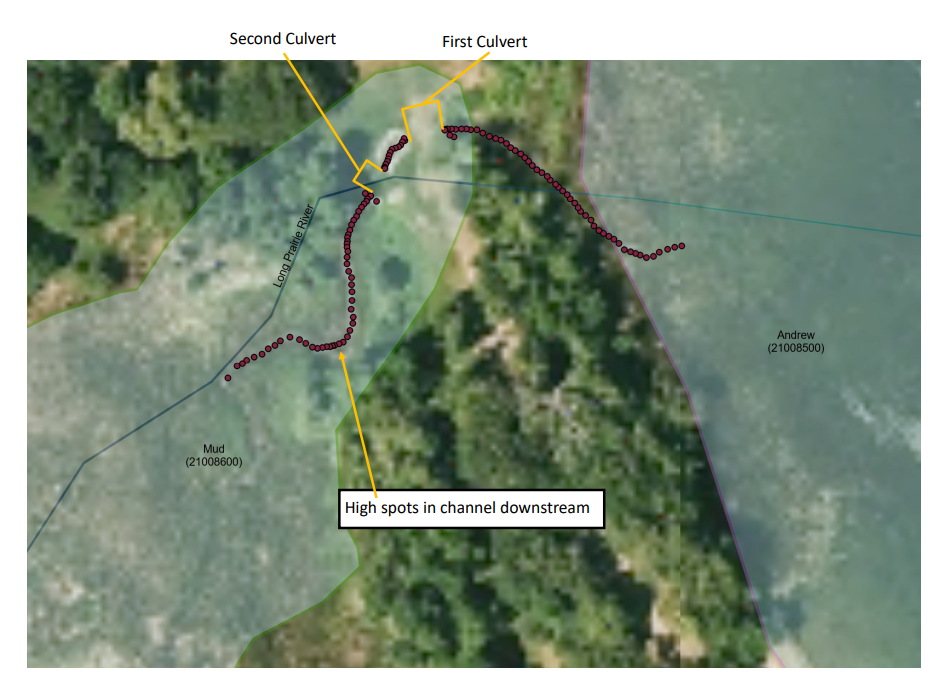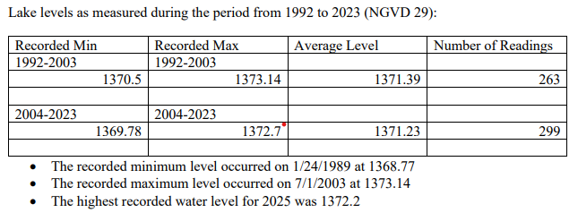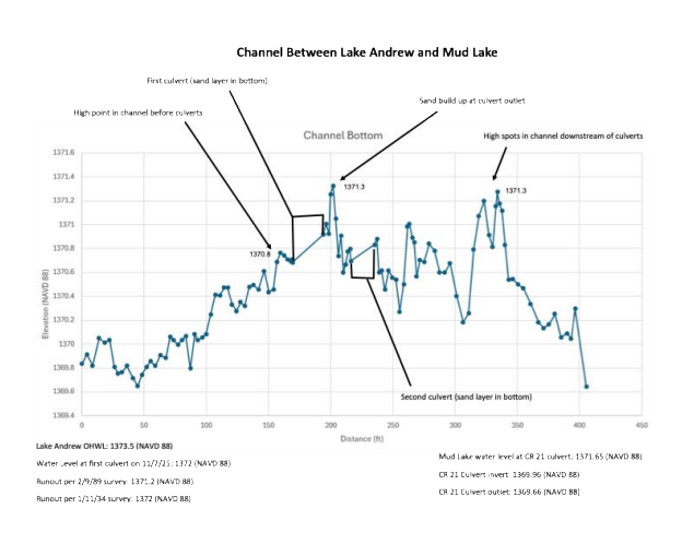 Issue: The Lake Andrew Association is devoted to listening to resident’s concerns and consequently trying to resolve them. One issue that remains in question is the run out elevation of the lake. The lakeside culvert elevation, determined by a survey company in April 2023, is 1370.0 National Geodetic Vertical Datum [NGVD (29)]. The run out elevation listed on the DNR website is 1370.6 (29). Of interest, Lake Andrew is the top of the watershed draining through Mud Lake into the chain of lakes and exiting Lake Carlos into the Long Prairie River. Research: The research and discovery effort yielded the following: the 1989 survey of the outlet, the permit issued by the DNR to install the culverts in 2004, the LAA contracted surveyor’s notes from April 2023, Jerry Mahoney’s findings, the recent DNR survey of the culvert area on November 7th, 2025 and discussions with the DNR hydrologist assigned to Lake Andrew. Analysis: The explanation by the DNR is supported by the restrictions and guidance within the permit. The permit states the culvert will be placed at an elevation below 1370.6 (29): recommending 9 to 12 inches below 1370.6 or an elevation between 1369.85(29) to 1369.6 (29). The rationale to set the culvert below the existing run out elevation is that over time sediment will collect in the base of a circular channel. There are two culverts in series located at the channel between Lake Andrew and Mud Lake. The distance from the outflow of the first culvert to the inflow of the second is approximately 20-25 feet. The channel between the culverts consists of a sandy bottom shouldered with rock. The discussions with the DNR detailed that the run out elevation is based on the elevation of the natural channel or a control point such as a culvert. Further exploration determined the run out elevation can vary from year to year. Natural occurrences such as ice heaves, wave action and excessive flow can alter the height of the natural channel either increasing or decreasing the run out elevation. For instance, the run out elevation determined by the 1989 survey is 1370.5 (29). Conclusion: The comprehensive DNR survey conducted in November 2025, established elevations at over 110 points upstream, downstream and in-between the two culverts. The survey used the NAVD 88 datum to determine elevations. In our area the 88 datum is .7ft higher than the NGVD 29 datum. The run out elevation, as determined by the 7 November survey, is 1371.3 NAVD 88 or 1370.6 NGVD 29. That elevation occurs shortly downstream of the first culvert on a high point in the sandy channel bottom. There is another point in the channel to Mud Lake, downstream of the second culvert that is also at the elevation of 1371.3 NAVD 88 or 1370.6 NGVD 29. The 2025 survey results are included later in the document. Numerous other factors can alter lake levels. The evaporation rates vary based on the temperature, humidity and wind action. Evaporation rates can exceed over an inch per week, given the right conditions. The lake is also fed by a number of springs and small streams. The drainage into the lake can be altered by current and previous years precipitation. Other factors would include the number of irrigation systems feeding off aquifers that feed the springs. Also, changes to areas surrounding the streams that feed the lake such as: crop cover, road and culvert altercations, drainage ditches and changes to pervious and impervious soils. And the lake can experience sub-surface gains or losses from / to aquifers and fissures. By a significant degree, the two biggest factors affecting lake levels are precipitation and evaporation! Supporting Information Elevation Datums: The elevation standards can get somewhat confusing if not clearly stated. The new datum, NAVD 88 for our area is .7ft higher than the previous datum, NGVD 29. See DNR conversion figure below. • To equate the elevation, subtract .7 ft from the NAVD 88 elevations. • To convert fractional feet into inches just multiply by 12 (.7ft x 12 in/ft = 8.4 in). NGVD 29 (National Geodetic Vertical Datum of 1929) is the older, less accurate elevation system replaced by NAVD 88 (North American Vertical Datum of 1988), a more precise standard incorporating modern techniques like GPS and gravity measurements, with differences varying by location, typically around a foot or more higher in NAVD 88 than NGVD 29, requiring specific conversion tools for accurate transitions. Additional Analysis: The DNR completed a Lake Andrew surface water level analysis in November of 2023. The analysis compared two time periods, one from 1992 to 2003 and the other from 2004 to 2023. The first time period analyzed the lake level prior to the insertion of the culverts and the second the 19 years following the installation. The analysis indicated there has been a minor change in average water levels after the installation of the culverts. The average change amounted to less than two inches. The minimum water level measurement, after the culvert installation, is 8 ½ inches lower than the minimum from 1992 to 2004. Further analysis of precipitation levels for the two time periods revealed a significant difference: the 1992 to 2004 period had remarkably high precipitation amounts.